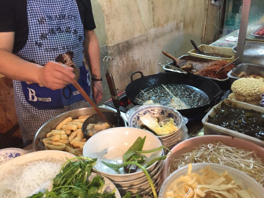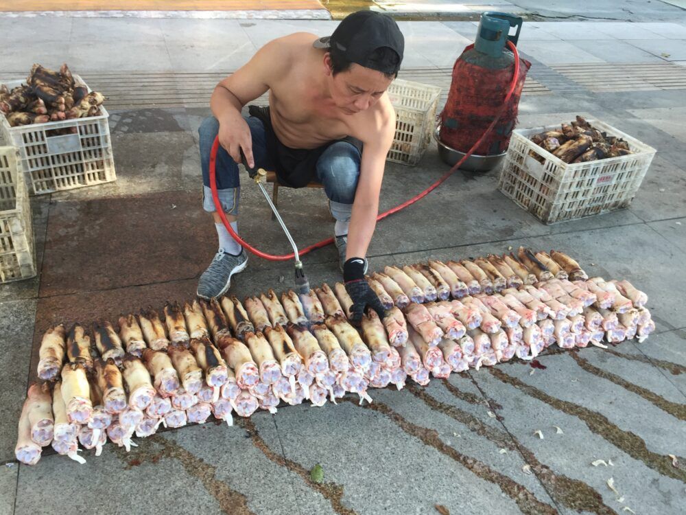 This guy is burning the bristles off of pigs feet, ON THE SIDEWALK!
