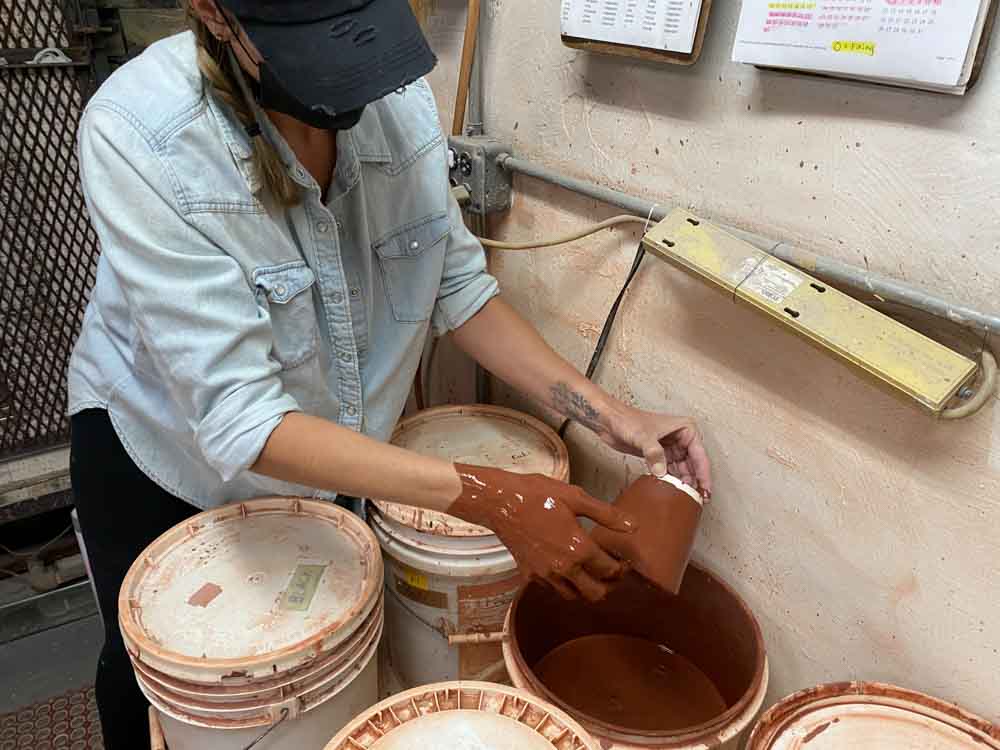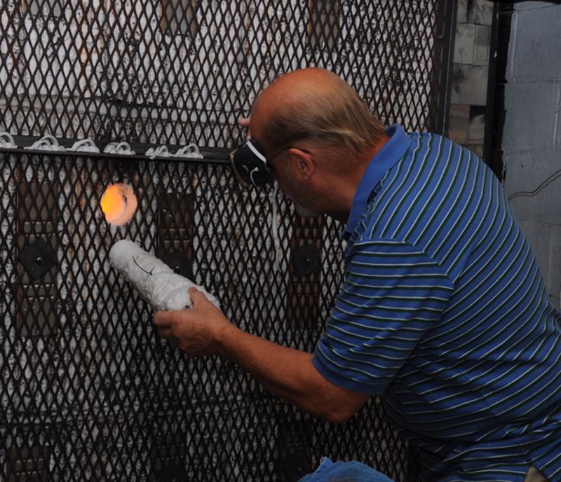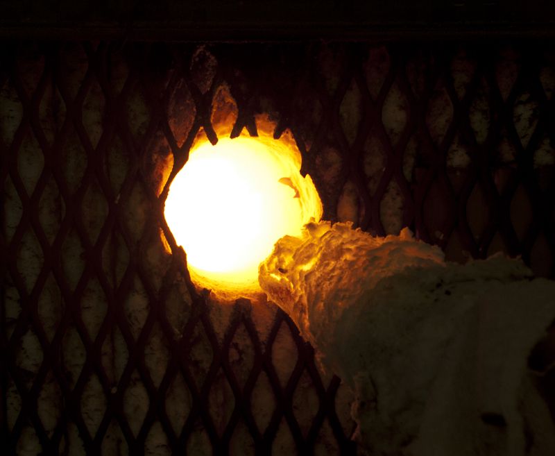 As the temperature inside the kiln increases the color goes from red to orange to white as we climb to 2400 degrees. A firing takes 18 hours to heat up and another 18 to cool down.