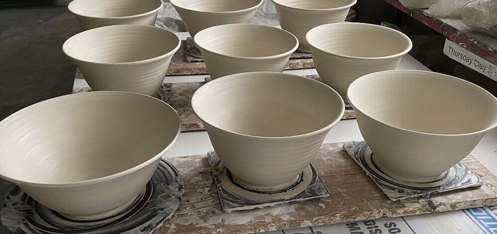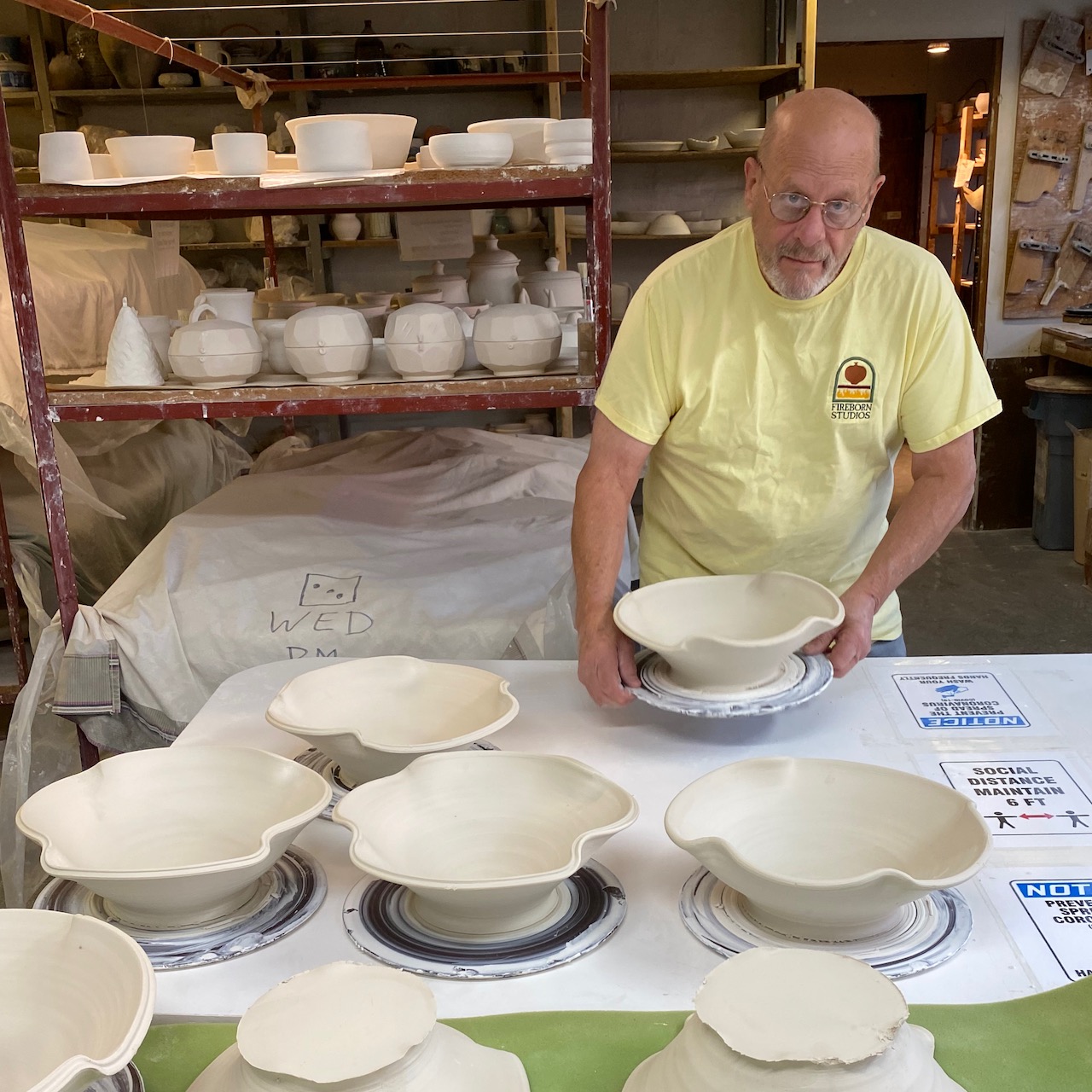 Making pots involves many steps but our favorite and most creative part is forming new pieces from the soft clay. Most of our work is thrown on a potter’s wheel. Sometimes we alter thrown pieces to create more organic forms. Sometimes we use slabs and other hand-building techniques. Sometimes we design in a sketch book, but usually we sketch directly in clay. As we work we visualize the final product, including its form, color and function.